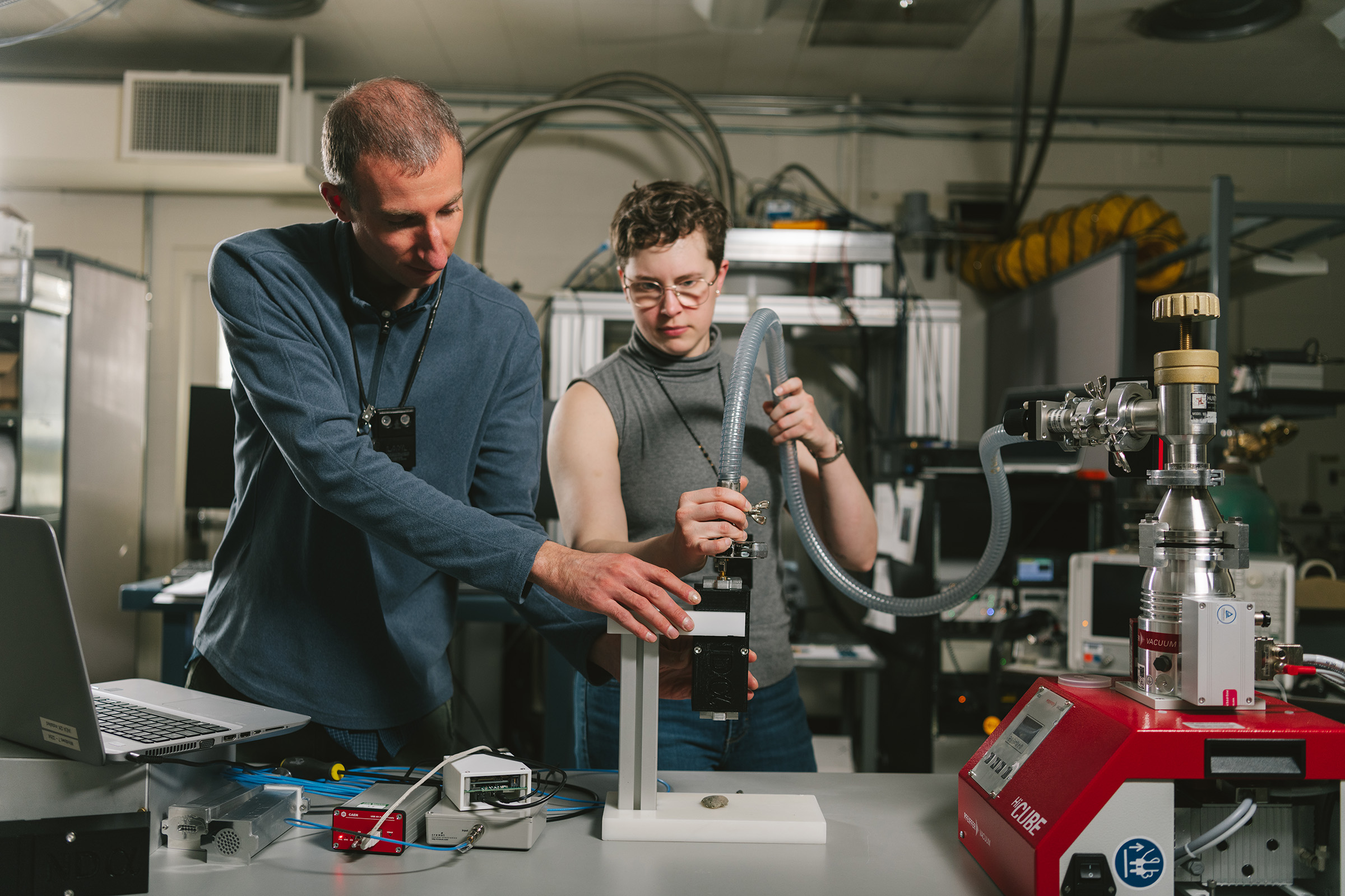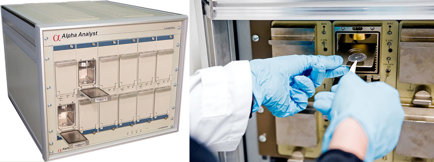 Because alpha particles have a short penetration range, samples often need to be prepared as a thin layer to minimize energy loss and allow precise measurements (Fig. 2: a traditional benchtop alpha spectrometer works by measuring the alpha emission spectrum from a prepared sample placed in a vacuum chamber). Croce says, “We considered the problem the other way, where you just accept that you have terrible alpha samples: they're dirty, they're thick. So, they attenuate the alpha radiation—but what can you do with that?”