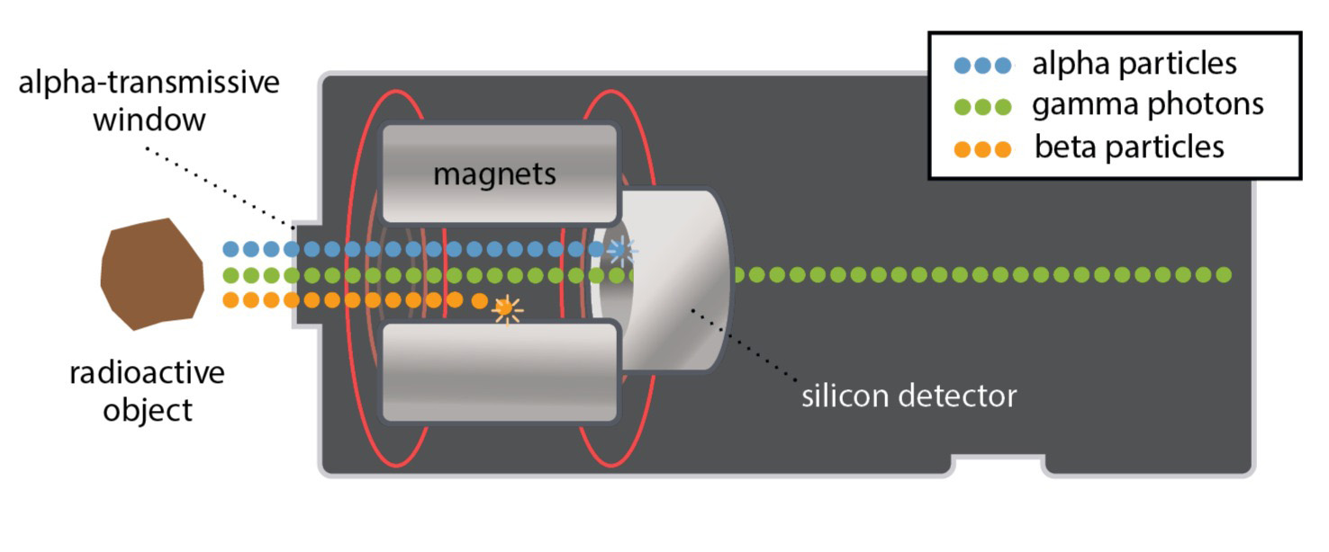 - A magnetic filter which enables the instrument to be pointed directly at something as intensely radioactive as spent nuclear fuel, containing mixtures of fission products that emit beta radiation. The magnetic field traps beta radiation, which could otherwise swamp the detector. Filtering of gamma radiation meanwhile occurs naturally because of the inherent insensitivity of the thin silicon detector to gamma rays.
