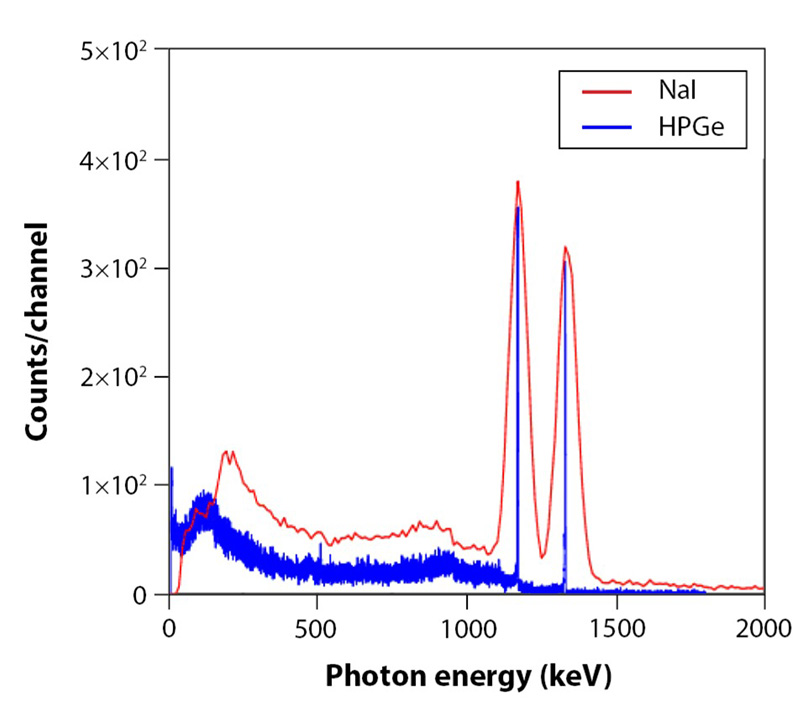 Semiconductor detectors made from high purity germanium (HPGe) offer a significant increase in energy resolution over sodium iodide scintillators, which, despite their many advantages, give very broad gamma-ray peaks by comparison (Fig. 4). This means that closely spaced peaks cannot always be resolved with scintillator detectors, making them unsuitable for complicated mixtures of materials or with elements that have multiple isotopes and emit many gamma energies. The germanium crystal used in HPGe detectors is extremely pure—in excess of 99.999999999%. This is far beyond the purity of typical semiconductor-grade materials, as even trace impurities can dramatically degrade detector performance.