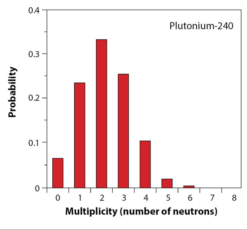 A solution to this problem can be arrived at by looking at the time distribution of neutron detections: spontaneous fission produces bursts of time-correlated neutrons (Fig. 7 shows the probability distribution of the number of neutrons in each burst for plutonium-240), whereas emission from (α,n) reactions creates individual, uncorrelated neutrons at random. With this knowledge, a method called coincidence counting uses statistical analysis methods to count the pairs of correlated neutrons which can only be produced from fission events. The “doubles” count is the number of coincidence events where two neutrons are detected within a defined time window (usually microseconds)—which indicate neutrons from the same fission chain or event.