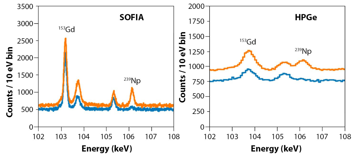 This innovation was essential to achieve high count rates (up to 5,000 counts/ sec), enabling measurement times comparable to those of HPGe detectors, while also allowing for a more compact instrument than previous TES-based microcalorimeters. Using SOFIA, the uranium-235/plutonium-239 ratio (an important yardstick in mixed-oxide nuclear fuels) can be determined with a 1-sigma precision of below 1.0% in hours (compared to several percent for an HPGe detector running for the same time).
